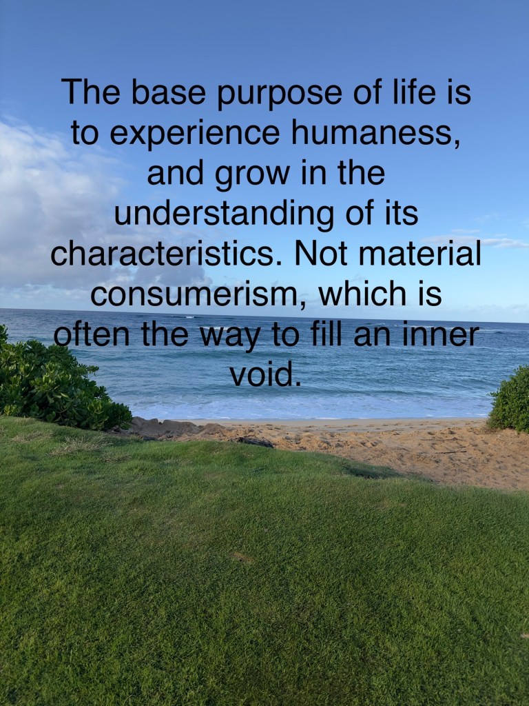 The base purpose of life is to experience humaness, and grow in the understanding of its characteristics. Not material consumerism, which is often the way to fill an inner void.