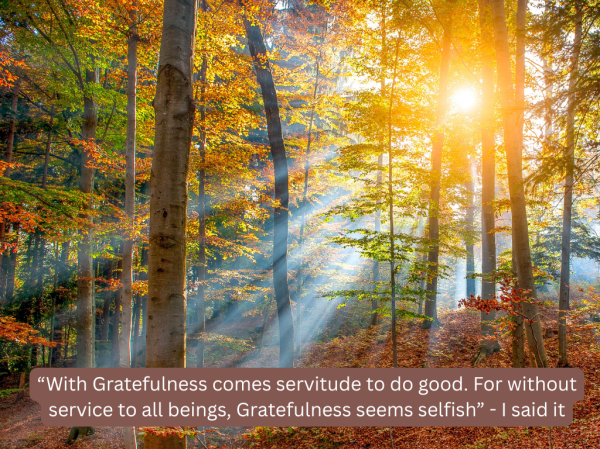 “With Gratefulness comes servitude to do good. For without service to all beings, Gratefulness seems selfish”